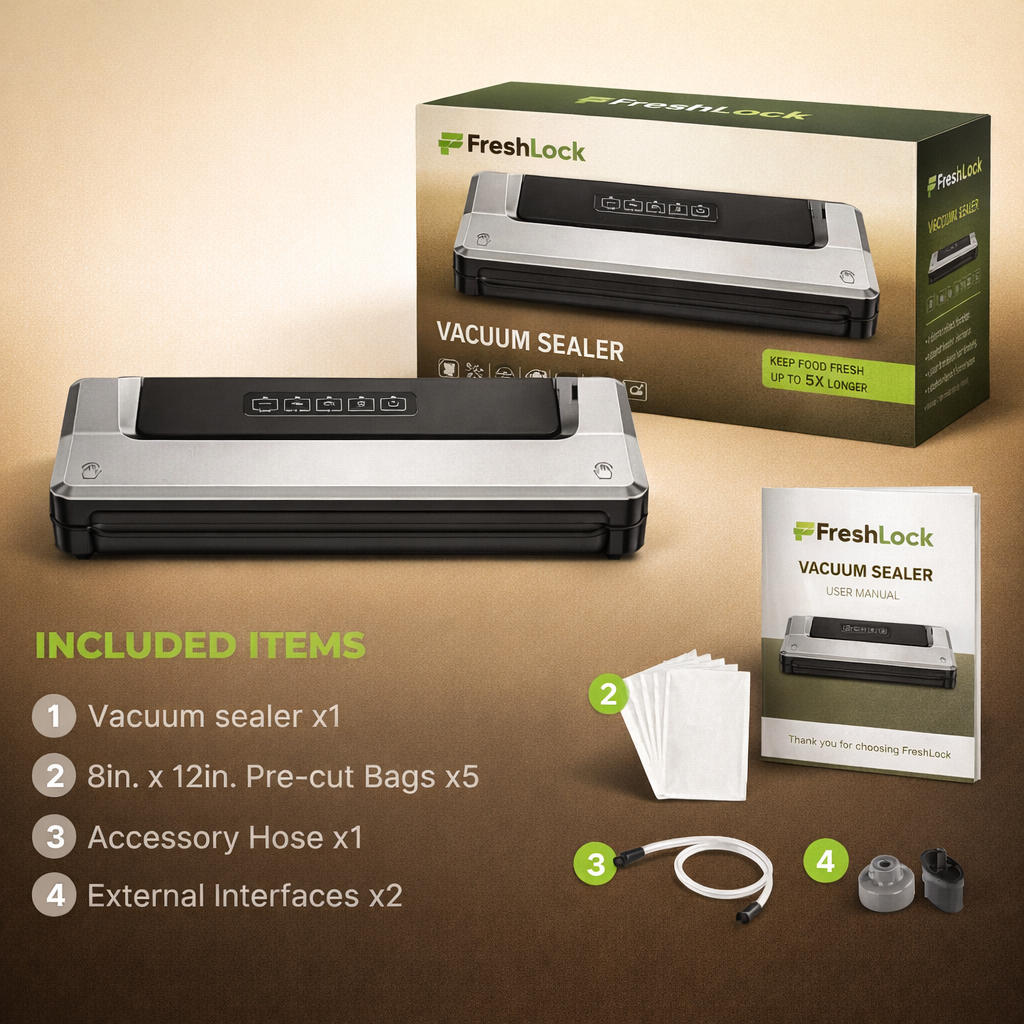 Every FreshLock comes with the vacuum sealer machine, 5 pre-cut vacuum bags, 1 external accessory hose, 2 external interfaces, and a detailed tutorial guide. It's backed by a full 3-year quality commitment — that's three times the industry standard 1-year warranty.